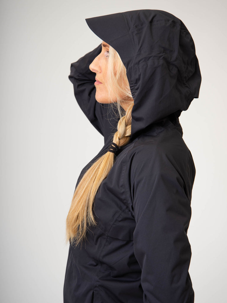 Fully seam-sealed and made from premium recycled polyester with PU coating, the jacket offers advanced protection from wind and rain while maintaining breathability and luxurious comfort. A fitted hood with formed peak keeps you — and your hair — dry, whether worn alone or layered over a cap.